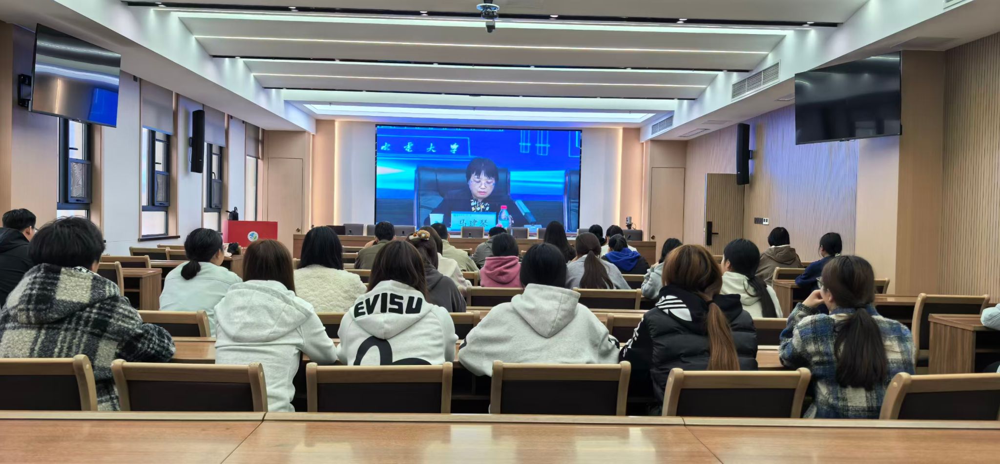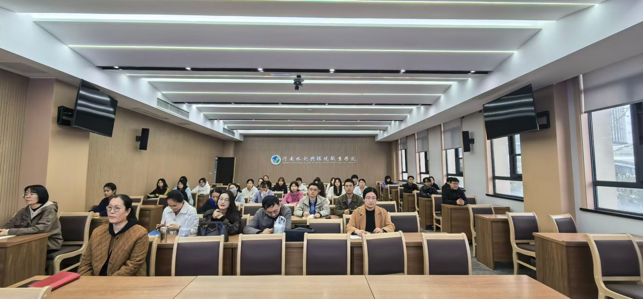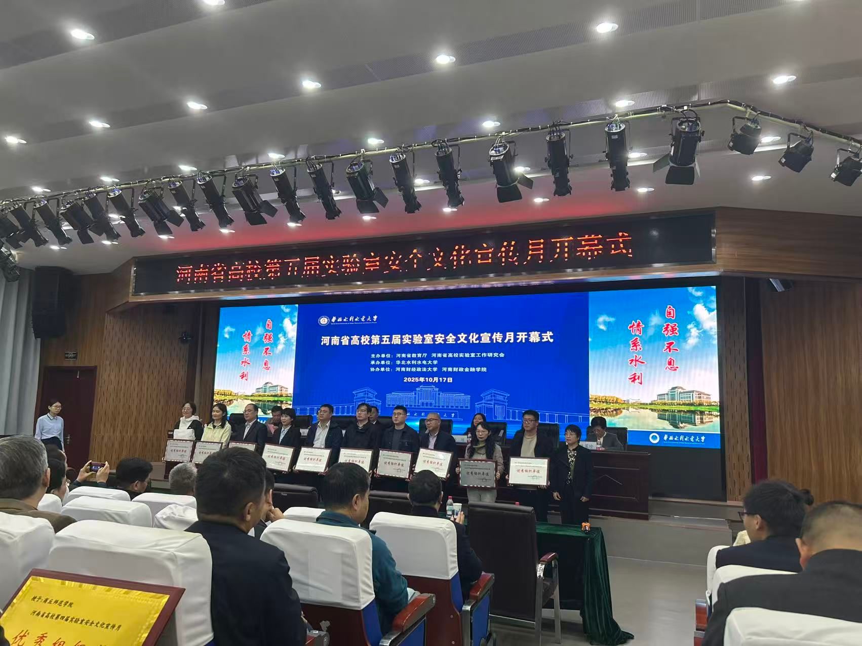 活动采用“线下主会场+线上同步直播”的模式,师生代表在航空港校区博学楼会议室集中收看,其余学生通过线上渠道同步参与。作为2024年全省高校实验室安全月和实验室安全知识与技能大赛两个“优秀组织奖”的获奖单位,学校派代表受邀前往开幕式现场华北水利水电大学(龙子湖校区)综合实验楼多功能报告厅领奖。