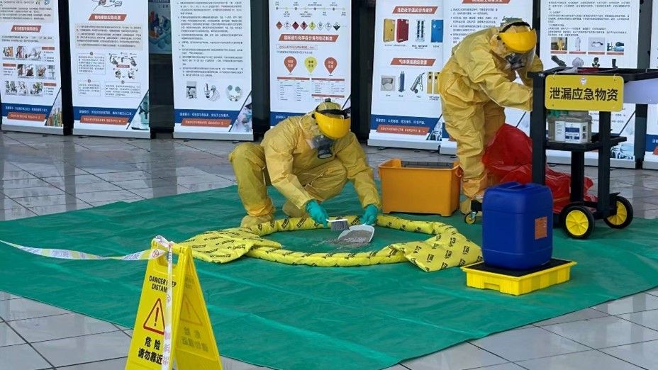 11月11日,实验实训中心组织环境与生态学院、水利工程学院相关专业师生进行实验室危化品泄露应急演练。演练模拟了实验操作过程中意外打翻浓盐酸试剂的事故场景,参演学生按照应急预案迅速行动,有序开展现场自救互救、事故上报、紧急疏散、个人防护、泄漏物处置、环境清理等工作。